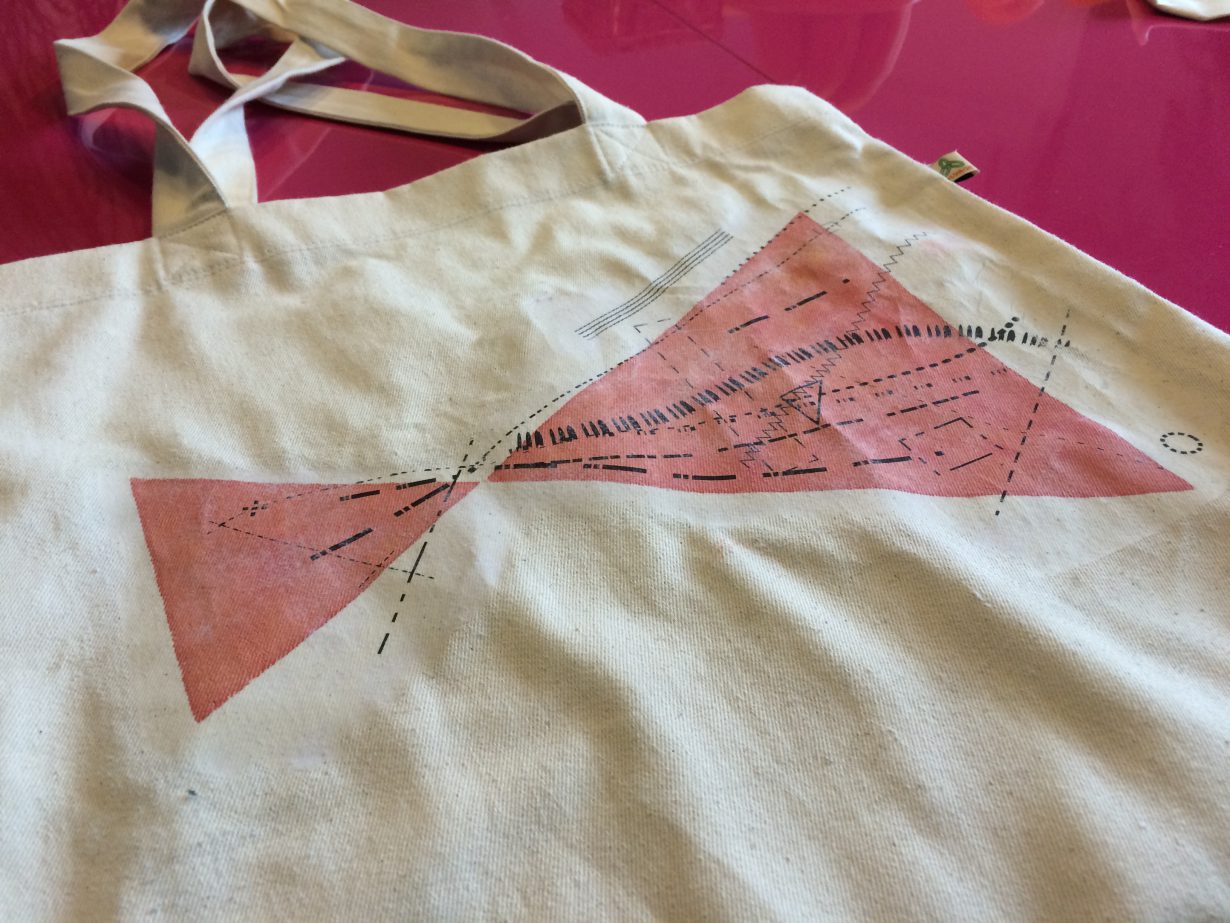 We layered the design over the fabric paint using a gel medium. The gel acted as a container for the ink, sealing it onto the surface of the bag while the paper disintegrated with water.